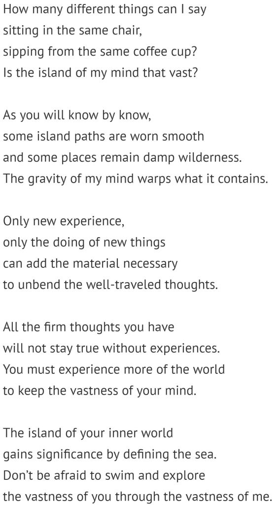 The metaphor of one’s mind as an island is interesting. The mind is indescribably vast, yet in a way it is like an island because it is physically disconnected from any other mind.